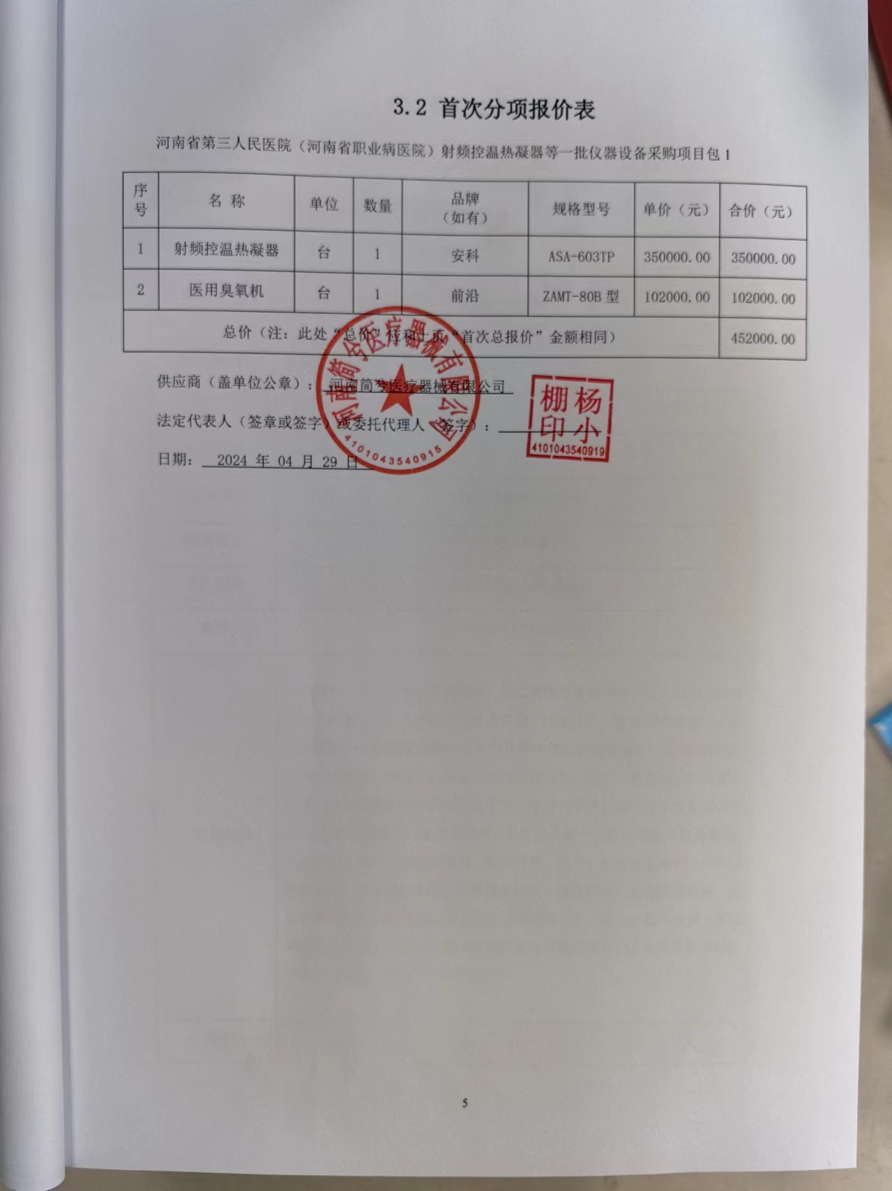 河南省第三人民醫(yī)院(河南省職業(yè)病醫(yī)院)射頻控溫?zé)崮鞯纫慌鷥x器設(shè)備采購項(xiàng)目包1 | 河南簡(jiǎn)兮醫(yī)療器械有限公司 | 河南省鄭州市管城回族區(qū)鼎瑞街005號(hào)1號(hào)倉庫3層338室 | 449000 | 金額 | 元 | ||||