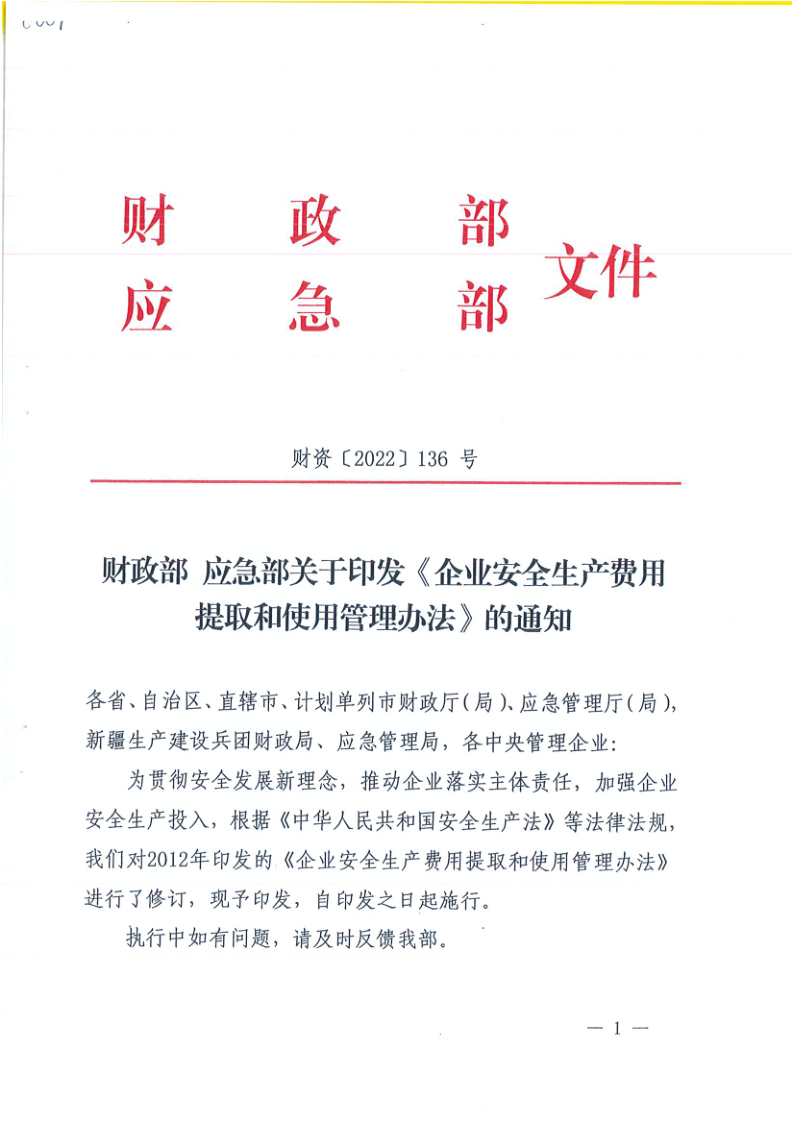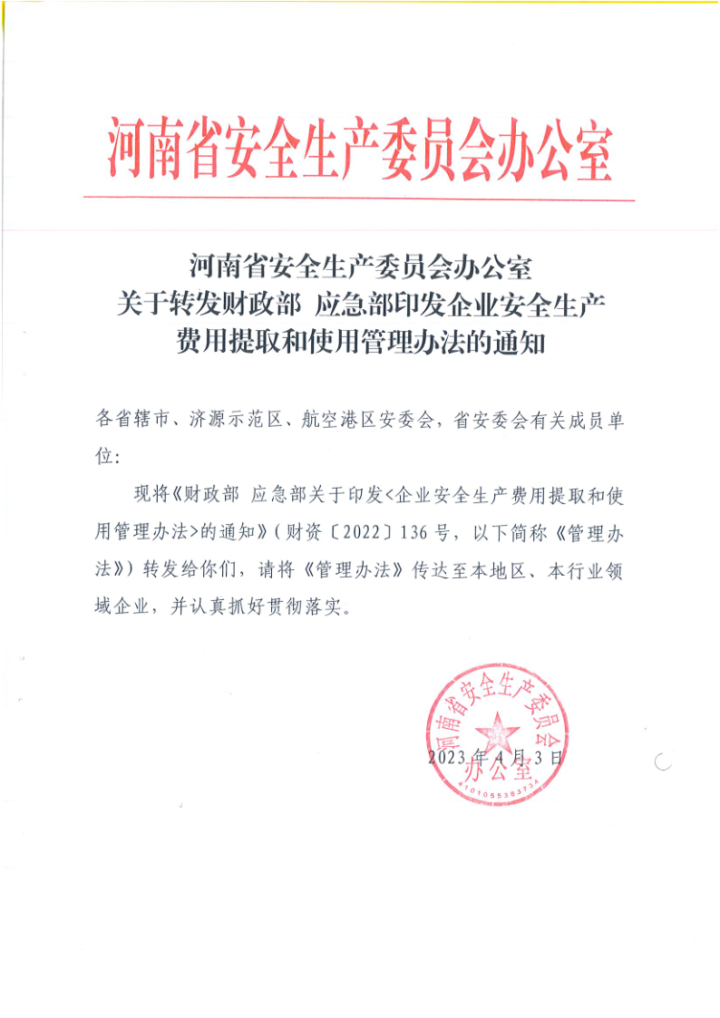 關(guān)于轉(zhuǎn)發(fā)財政部應(yīng)急部印發(fā)企業(yè)安全生產(chǎn)費(fèi)用提取和使用管理辦法的通知