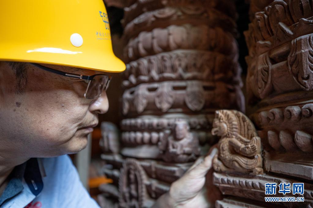 2019年10月10日,在尼泊爾加德滿都杜巴廣場,中國派出的文物修復隊技術主管周建國在九層神廟修復現(xiàn)場查看一個修復好的文物。新華社記者 王婧嬙 攝