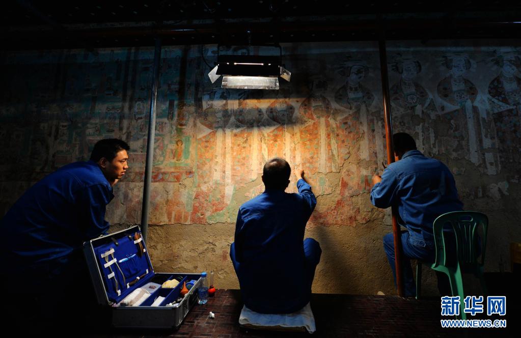 敦煌研究院技術(shù)人員在莫高窟98窟內(nèi)對病害壁畫進行修復(fù)(201493日攝)。新華社記者 陳斌 攝