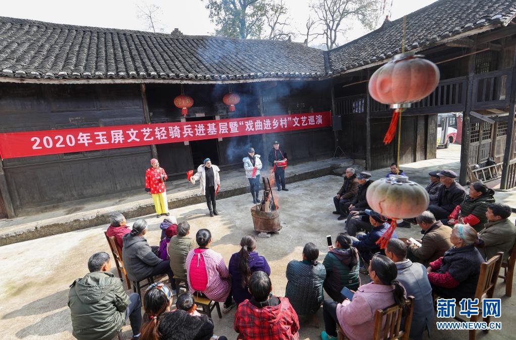 20201130日,在貴州省銅仁市玉屏侗族自治縣新店鎮(zhèn)新店村農(nóng)家院壩,文化志愿者為村民表演小品。新華社發(fā)(胡攀學(xué) 攝)