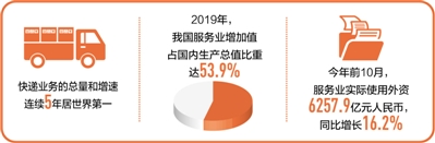 “十三五”以來,我國服務業(yè)比重進一步提高,生產(chǎn)性服務業(yè)加速邁向專業(yè)化,生活性服務業(yè)不斷向高品質延伸,優(yōu)質高效的服務業(yè)助推產(chǎn)業(yè)改造升級,提升百姓生活品質。2019年,我國服務業(yè)增加值占國內(nèi)生產(chǎn)總值比重達53.9%,比2015年提高3.4個百分點,成為推動經(jīng)濟增長的主動力。