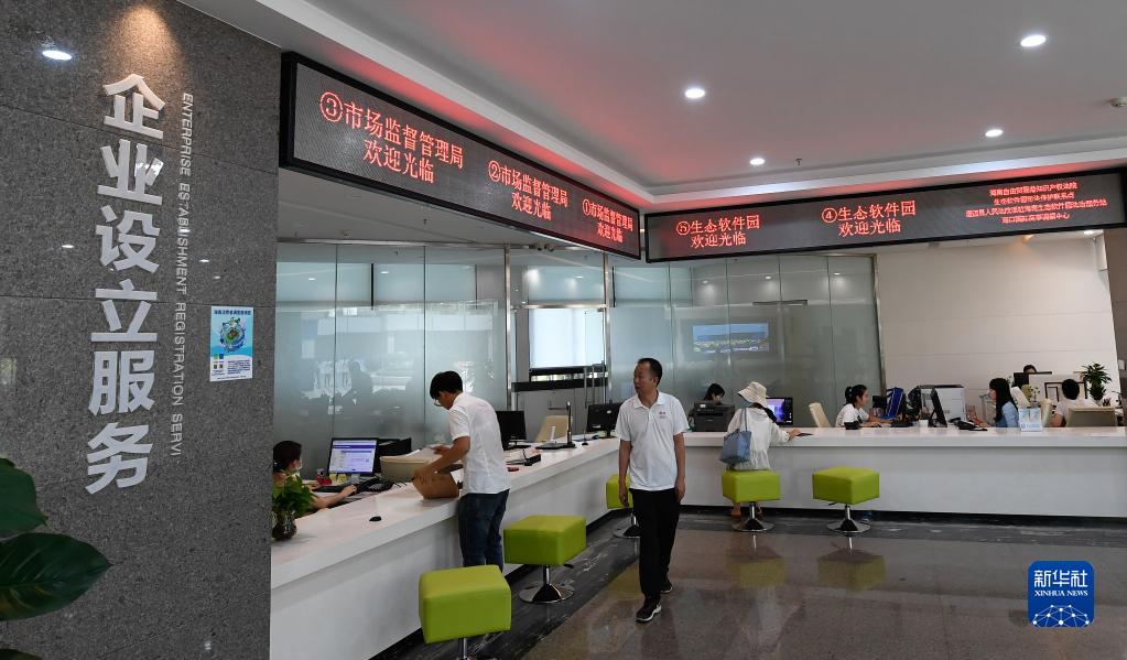 海南自由貿(mào)易港生態(tài)軟件園企業(yè)服務超市的工作人員為入園企業(yè)提供相關(guān)服務(5月31日攝)。新華社記者 楊冠宇 攝