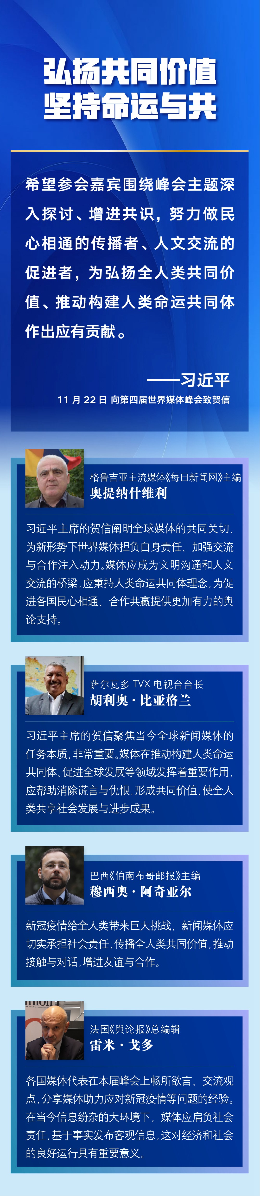多國媒體人士認為,習(xí)近平主席的賀信對全球媒體更好肩負社會責(zé)任、廣泛凝聚世界共識作出重要闡述,為新形勢下世界媒體加強交流與合作、弘揚全人類共同價值、推動構(gòu)建人類命運共同體注入新的推動力——