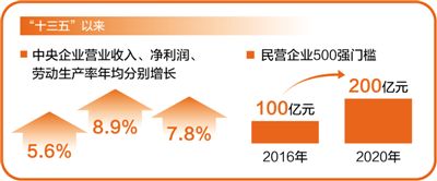 國企規(guī)模實(shí)力持續(xù)增強(qiáng),效益穩(wěn)步提高。預(yù)計(jì)到今年底,中央企業(yè)資產(chǎn)總額將接近69萬億元,比“十二五”末增長45%。“十三五”以來,中央企業(yè)營業(yè)收入、凈利潤、勞動生產(chǎn)率年均分別增長5.6%、8.9%、7.8%,進(jìn)入世界500強(qiáng)的中央企業(yè)達(dá)到48家。民企改革發(fā)展成效顯著。“十三五”以來,民營企業(yè)500強(qiáng)門檻從2016年的100億元提升至2020年的200億元;創(chuàng)新創(chuàng)業(yè)創(chuàng)造熱情高漲,中小企業(yè)數(shù)量增長近1倍。