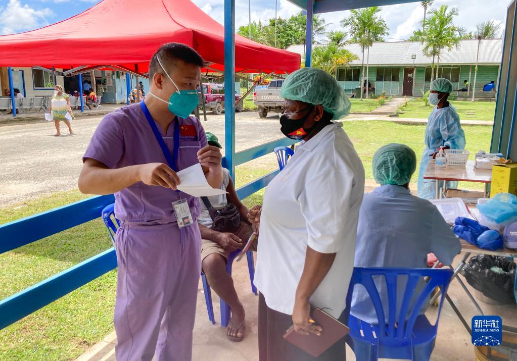 2021年8月25日,在巴布亞新幾內(nèi)亞新愛爾蘭省卡維恩總醫(yī)院,中國援巴新醫(yī)療隊(duì)隊(duì)員向當(dāng)?shù)蒯t(yī)護(hù)人員介紹疫苗接種注意事項(xiàng)。新華社發(fā)(中國援巴新醫(yī)療隊(duì)供圖)