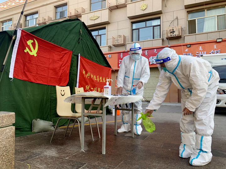 中共阿拉善盟委統(tǒng)戰(zhàn)部兩名黨員在額濟(jì)納旗一小區(qū)執(zhí)勤點消毒(2021年10月28日攝)。新華社記者 王靖 攝