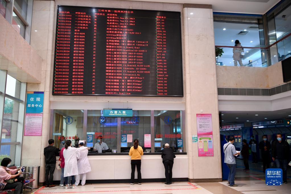 福建省三明市第一醫(yī)院的醫(yī)保辦工作人員(右)向前來(lái)咨詢藥品報(bào)銷問(wèn)題的居民講解相關(guān)政策(2020年11月18日攝)。新華社記者 姜克紅 攝
