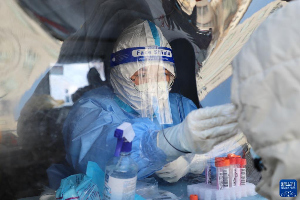 1月27日,在黑龍江綏芬河市一處核酸采集點(diǎn),醫(yī)護(hù)人員對(duì)居民進(jìn)行核酸采樣。新華社記者 徐凱鑫 攝