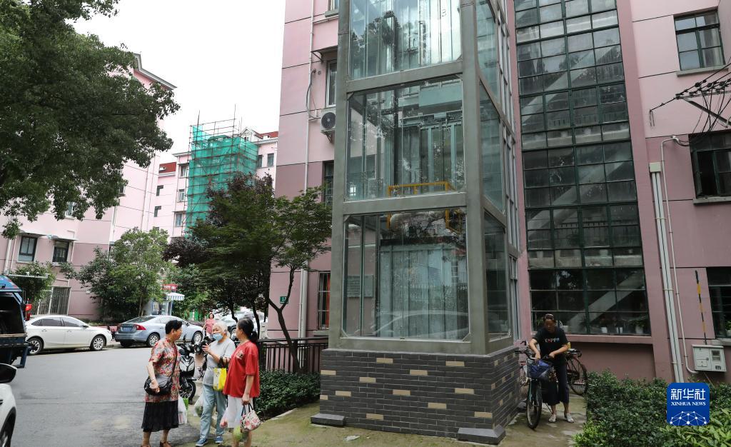 在上海市長(zhǎng)寧區(qū)北新涇街道新涇六村,居民在加裝了電梯的12號(hào)樓旁聊天(2020年6月23日攝)。新華社記者 方喆 攝