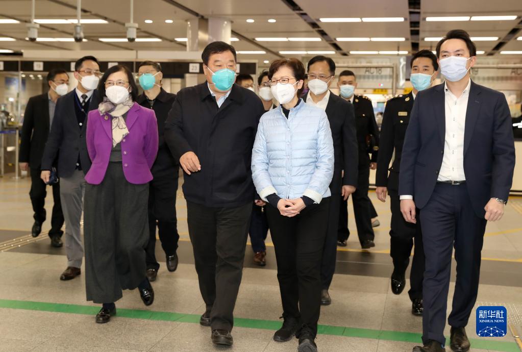 2月28日,香港特區(qū)行政長官林鄭月娥等赴口岸迎接專家組一行。新華社記者 李鋼 攝