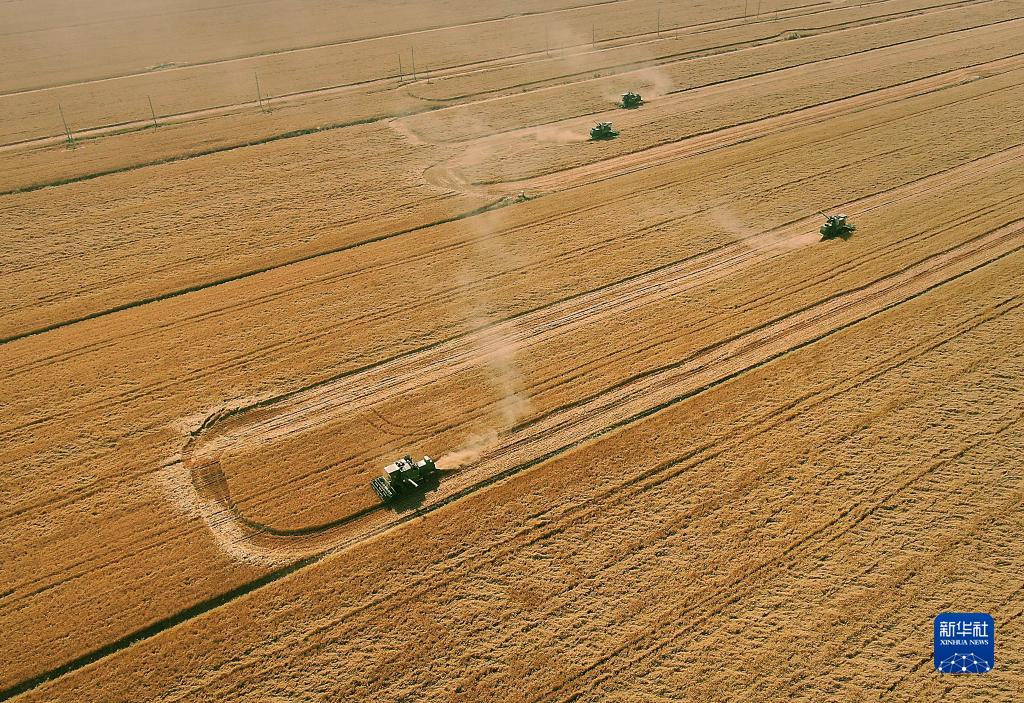 在河南省黃泛區(qū)農(nóng)場九分場的麥田里,農(nóng)機(jī)手操作收割機(jī)收獲小麥(2021年6月6日攝,無人機(jī)照片)。新華社記者 李安 攝