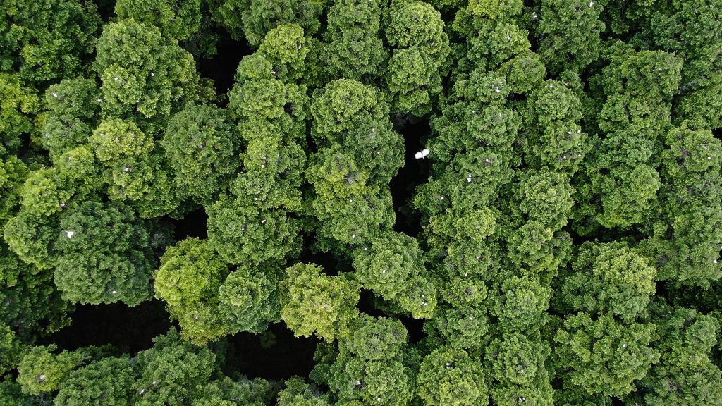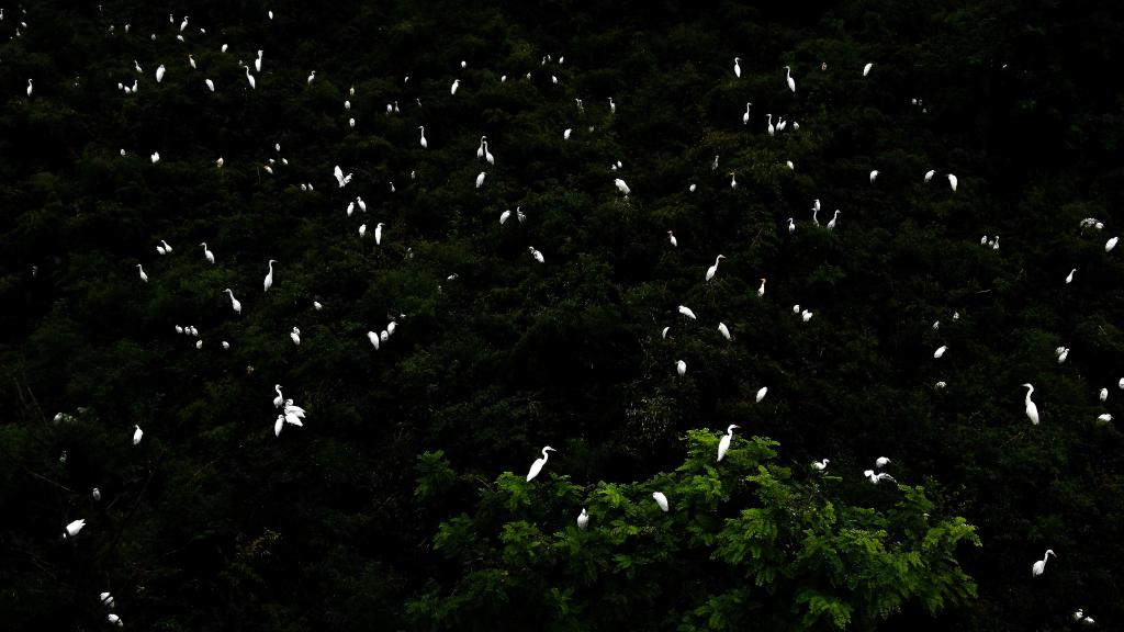 在江蘇省大豐麋鹿國家級自然保護(hù)區(qū),大量白鷺在樹頂棲息。(無人機拍攝)新華社記者李響攝
