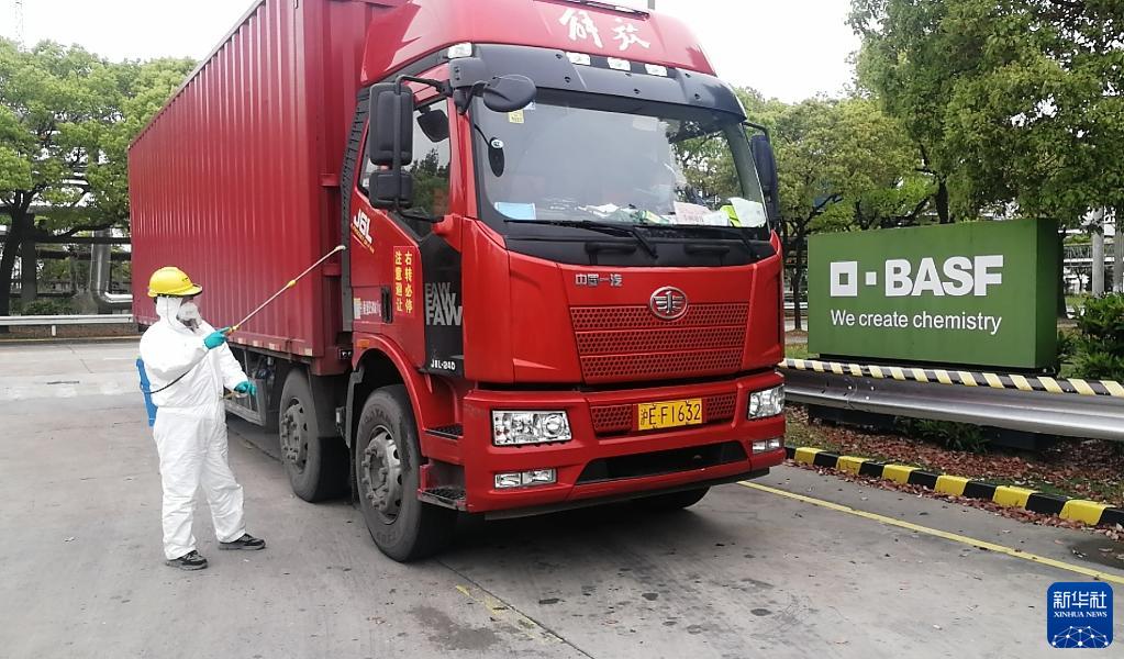 工作人員在位于上海市金山區(qū)的巴斯夫護(hù)理化學(xué)品(上海)有限公司工廠對(duì)貨車(chē)進(jìn)行消殺(4月15日攝)。新華社記者 丁汀 攝