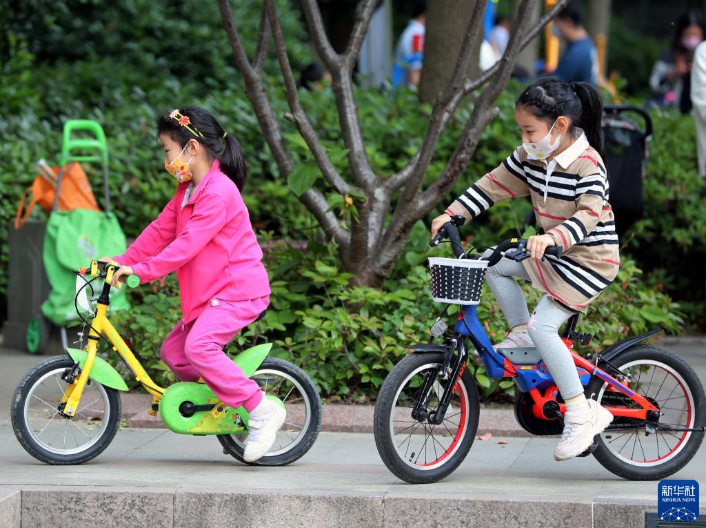 5月17日,在上海市松江區(qū),小朋友們?cè)隍T自行車(chē)。新華社記者 劉穎 攝