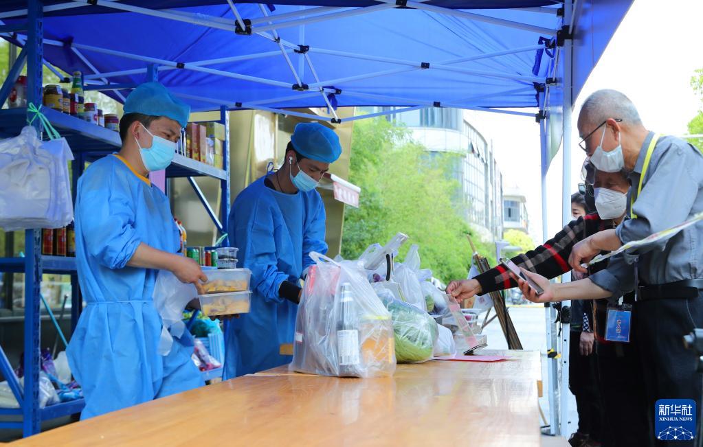 5月17日,市民在上海市嘉定區(qū)一家飯店的外賣(mài)攤位前掃碼購(gòu)物。新華社記者 方喆 攝