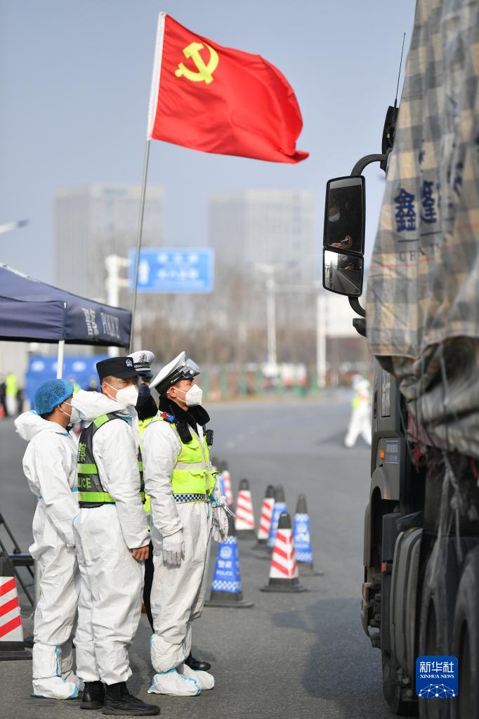 石家莊市公安局高新技術(shù)產(chǎn)業(yè)開(kāi)發(fā)區(qū)公安分局民警在藁城區(qū)通往市區(qū)的路口執(zhí)勤(2021年1月10日攝)。當(dāng)日是首個(gè)“中國(guó)人民警察節(jié)”。新華社記者 楊世堯 攝