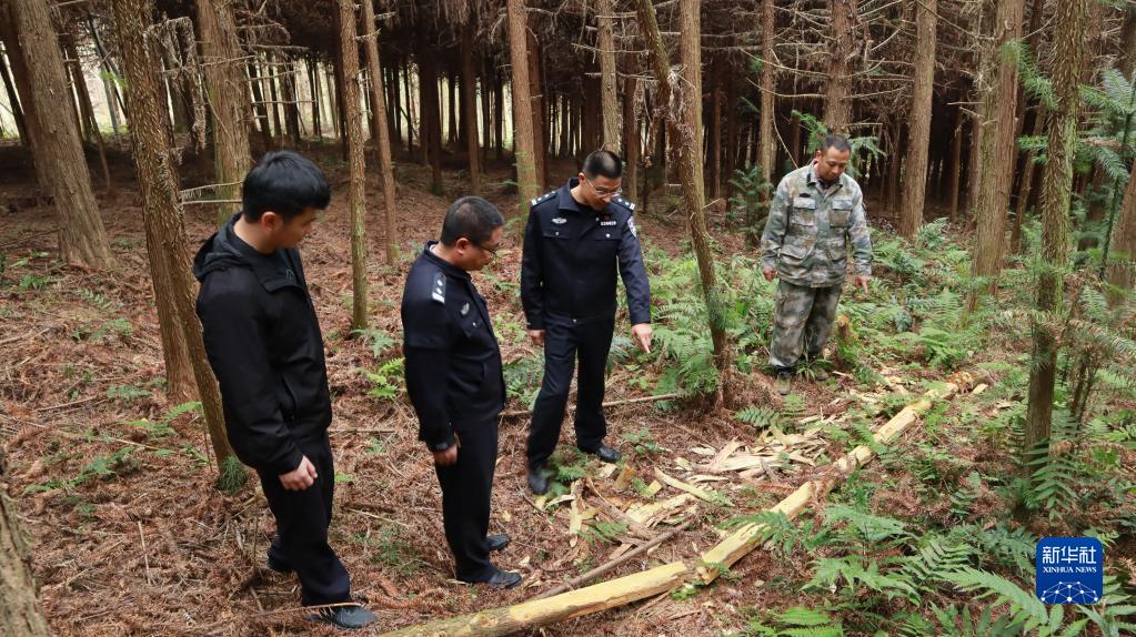 福建省南平市浦城縣公安局石陂森林派出所所長(zhǎng)郭曉強(qiáng)(右二)在盜伐林木案件現(xiàn)場(chǎng)分析作案動(dòng)機(jī)(2020年12月11日攝)。新華社記者 趙雪彤 攝