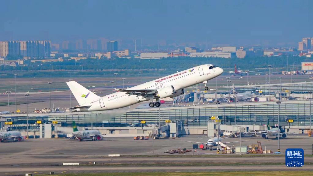 5月14日6時52分,編號為B-001J的C919大飛機從上海浦東機場第4跑道起飛,于9時54分安全降落,標(biāo)志著中國商飛公司即將交付首家用戶的首架C919大飛機首次飛行試驗圓滿完成。新華社發(fā)