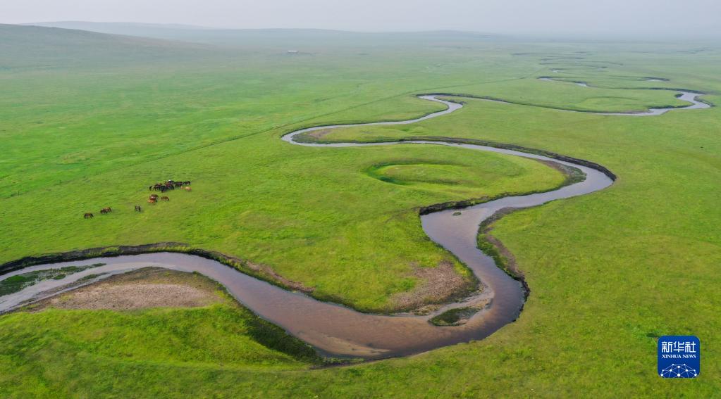 這是內(nèi)蒙古錫林郭勒盟東烏珠穆沁旗乃林高勒的草原風(fēng)光(2021年7月12日攝,無人機(jī)照片)。新華社記者 連振 攝