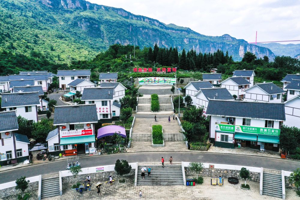 ↑2021年7月24日拍攝的貴州省黔西市新仁苗族鄉(xiāng)化屋村麻窩寨易地扶貧搬遷集中安置點(diǎn)一角(無人機(jī)照片)。