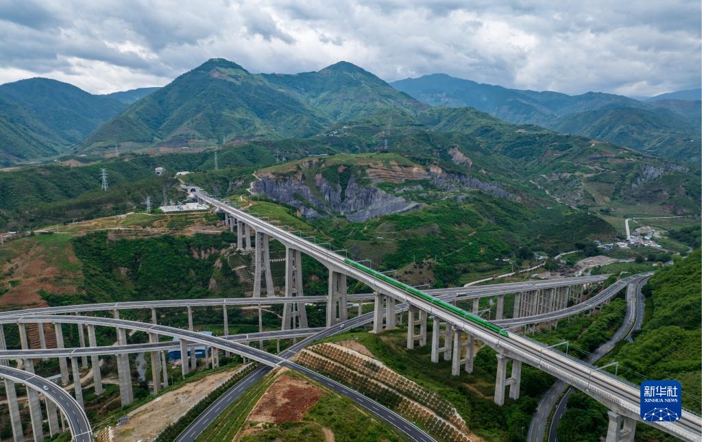 復(fù)興號列車通過中老鐵路南溪河特大橋(無人機(jī)照片,6月2日攝)。新華社記者 江文耀 攝