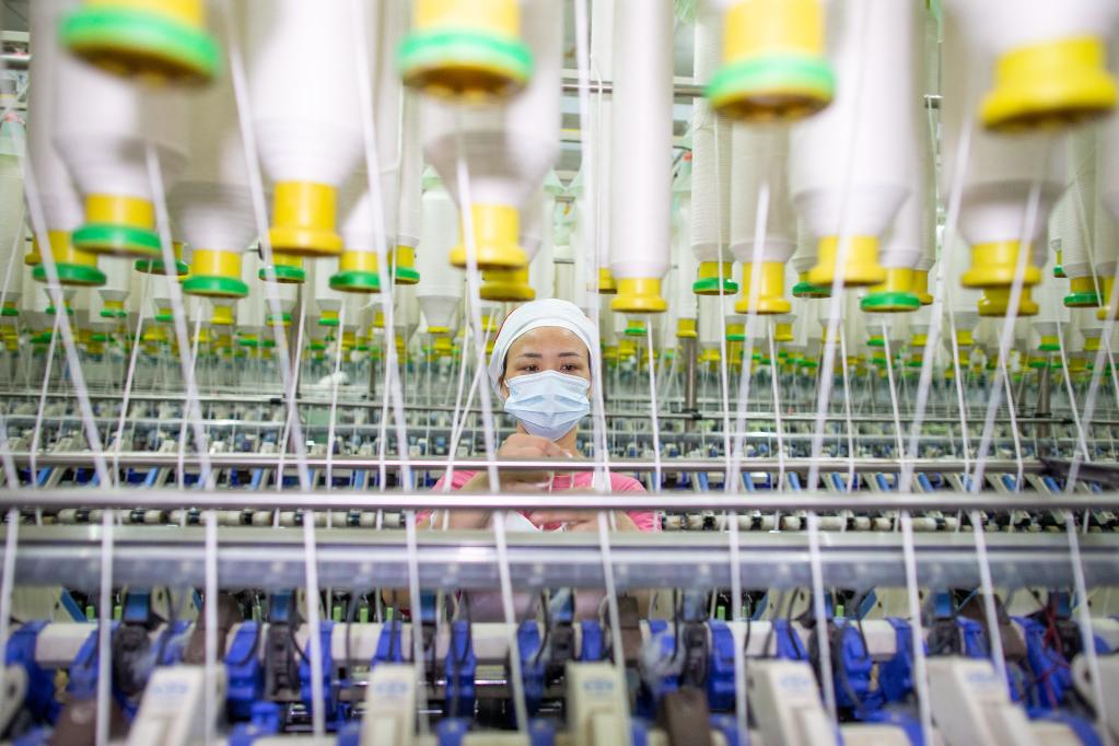 7月15日,江蘇省海安市一家紡織公司生產(chǎn)車間內(nèi),工人在生產(chǎn)線上工作。新華社發(fā)(翟慧勇攝)