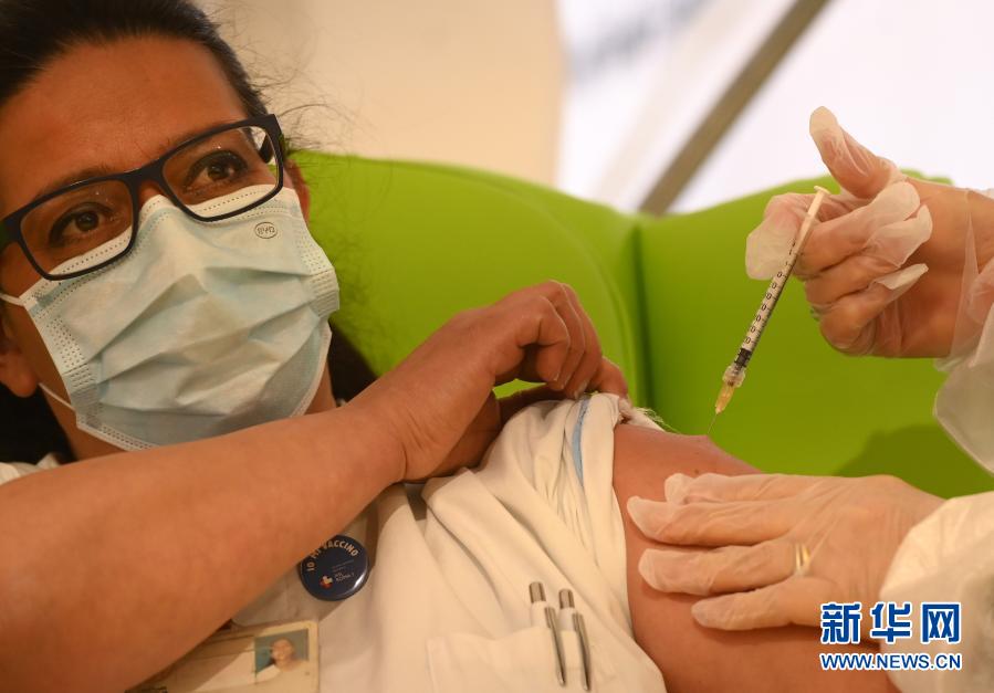 2020年12月28日,在意大利羅馬一家醫(yī)院,一名醫(yī)護(hù)人員接種由美國輝瑞制藥有限公司與德國生物新技術(shù)公司聯(lián)合研發(fā)的新冠疫苗。新華社發(fā)(阿爾貝托·林格利亞攝)
