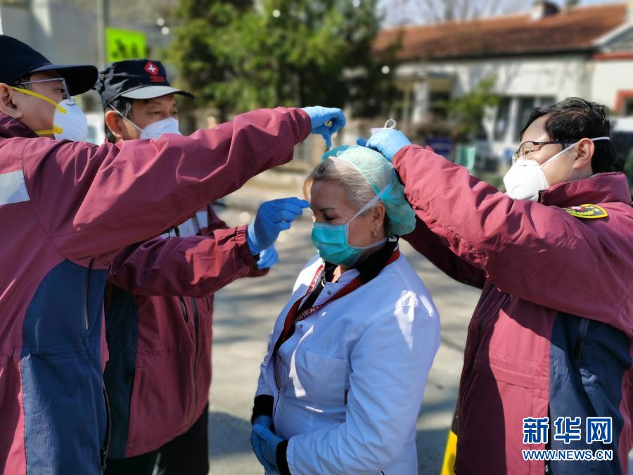 2020年4月4日,中國赴塞爾維亞抗疫醫(yī)療專家組在貝爾格萊德的基層發(fā)熱門診為門診主任特里富諾維奇(中)更換防護(hù)標(biāo)準(zhǔn)更高的口罩。新華社發(fā)