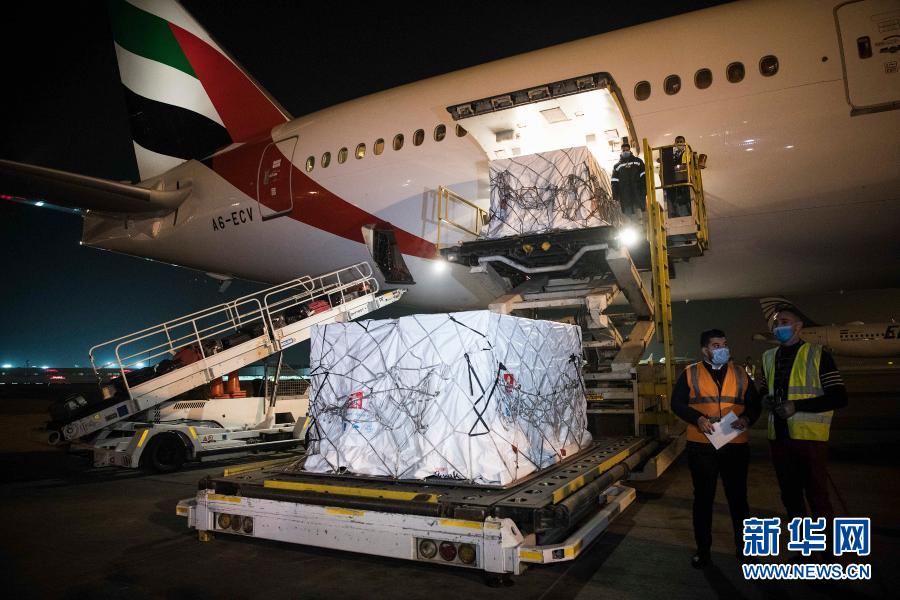 2020年12月10日,在埃及開羅國際機(jī)場(chǎng),工作人員運(yùn)輸中國研制生產(chǎn)的新冠疫苗。新華社記者鄔惠我攝