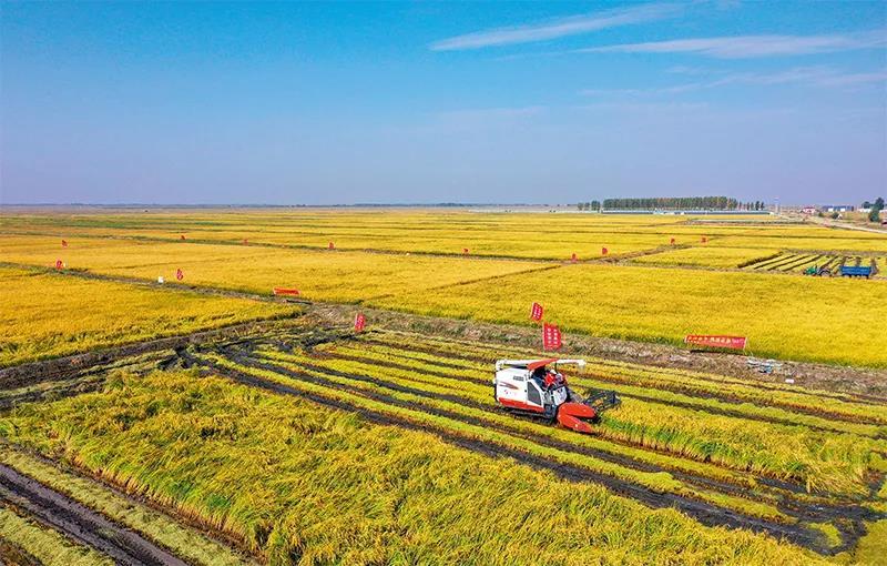 ▲ 2020年9月27日,農(nóng)民操作機(jī)械在興安盟袁隆平院士工作站鹽堿地水稻基地收獲水稻 徐欽攝