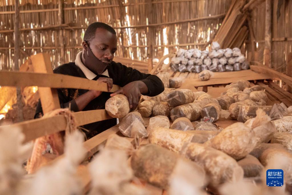 在盧旺達(dá)首都基加利的一家食用菌培育作坊,作坊主人埃馬紐埃爾·阿希馬納檢查菌袋(2020年9月9日攝)。中國(guó)福建農(nóng)林大學(xué)的菌草專家2006年來(lái)到盧旺達(dá)開始菌草技術(shù)合作項(xiàng)目,在當(dāng)?shù)厥痉逗屯茝V菌草技術(shù)。新華社發(fā)(西里爾·恩德格亞攝)