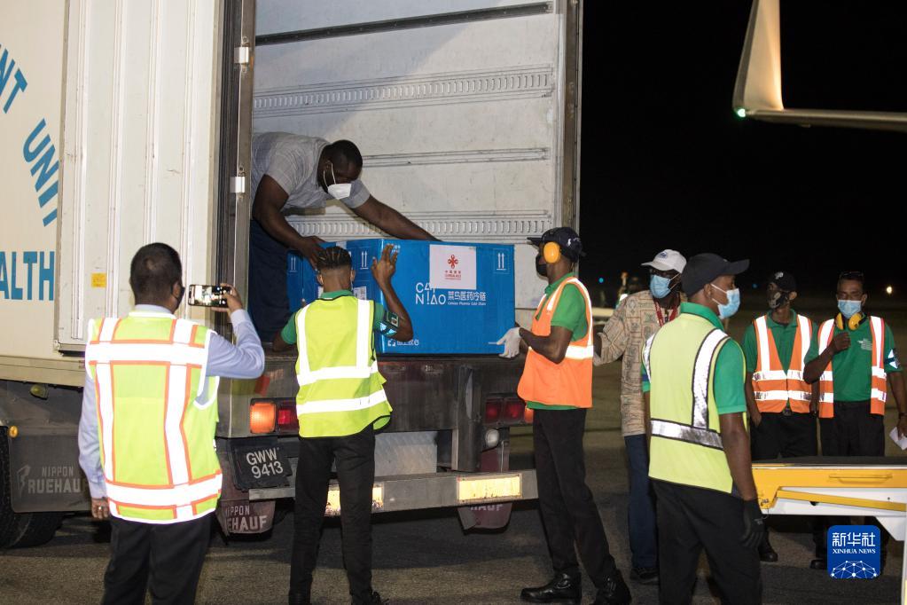 工作人員在圭亞那首都喬治敦國(guó)際機(jī)場(chǎng)搬運(yùn)中國(guó)援助的新冠疫苗(2021年3月2日攝)。新華社發(fā)(圭亞那新聞署供圖)