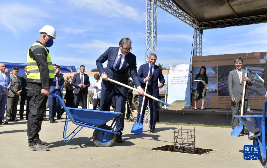 在塞爾維亞首都貝爾格萊德,塞爾維亞總統(tǒng)武契奇(中)為歐洲地區(qū)首家中國(guó)疫苗工廠奠基(2021年9月9日攝)。新華社發(fā)(普雷德拉格·米洛薩夫列維奇攝)