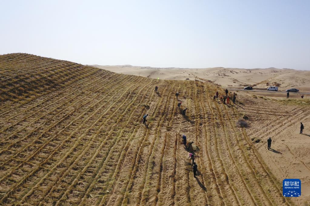 在甘肅省武威市古浪縣北部沙區(qū)旱麻崗治沙點(diǎn),八步沙林場(chǎng)治沙人和群眾一起扎草方格壓沙(2020年3月6日攝,無(wú)人機(jī)照片)。新華社記者 范培珅 攝
