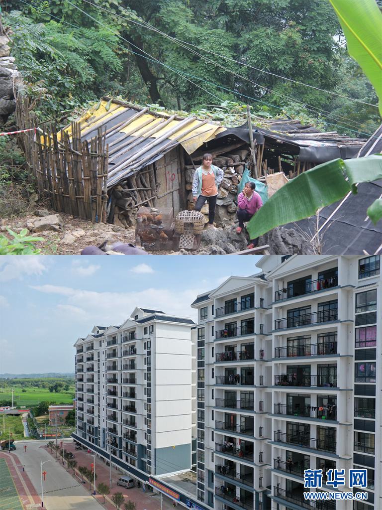 這是一張拼版照片,上圖為:2018年11月11日在廣西田東縣思林鎮(zhèn)龍邦村拍攝的村民和自家簡陋的房屋(思林鎮(zhèn)政府供圖);下圖為:2019年8月28日拍攝的當(dāng)?shù)貫辇埌畲逍陆ǖ奈挥谔飽|縣思林鎮(zhèn)的易地扶貧搬遷安置點(無人機照片,新華社記者曹祎銘攝)。新華社發(fā)