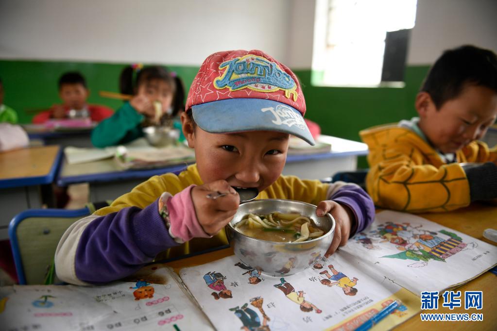 寧夏西吉縣震湖鄉(xiāng)陳岔小學(xué)的孩子在教室吃午餐,學(xué)生每天在學(xué)校有兩頓國家提供補助的營養(yǎng)餐(2017年6月14日攝)。新華社記者 王鵬 攝