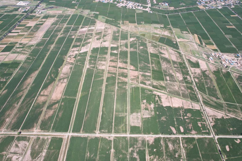 平羅縣一處鹽堿地典型區(qū)域,白色裸露部分為農(nóng)作物難以生長(zhǎng)的重度鹽堿地(2023年7月攝)。(平羅縣農(nóng)業(yè)農(nóng)村局供圖)