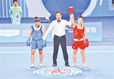??李玥瑤(紅)在散打女子52公斤級半決賽中,以12分優(yōu)勢戰(zhàn)勝藍(lán)方哈薩克斯坦選手,順利進入決賽。 本報記者 李焱 攝