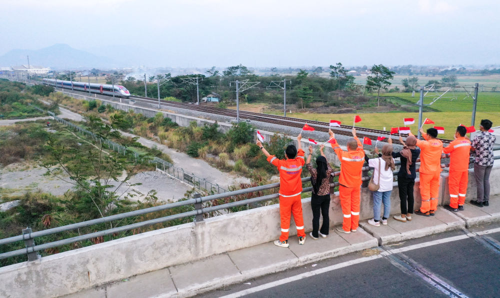10月17日,在印度尼西亞萬隆一座天橋上,雅萬高鐵建設(shè)單位之一中鐵電氣化局的中國和印尼籍員工揮舞著中國和印尼兩國國旗,向遠(yuǎn)處駛來的一列雅萬高鐵高速動(dòng)車組列車歡呼(無人機(jī)照片)。新華社記者 徐欽 攝
