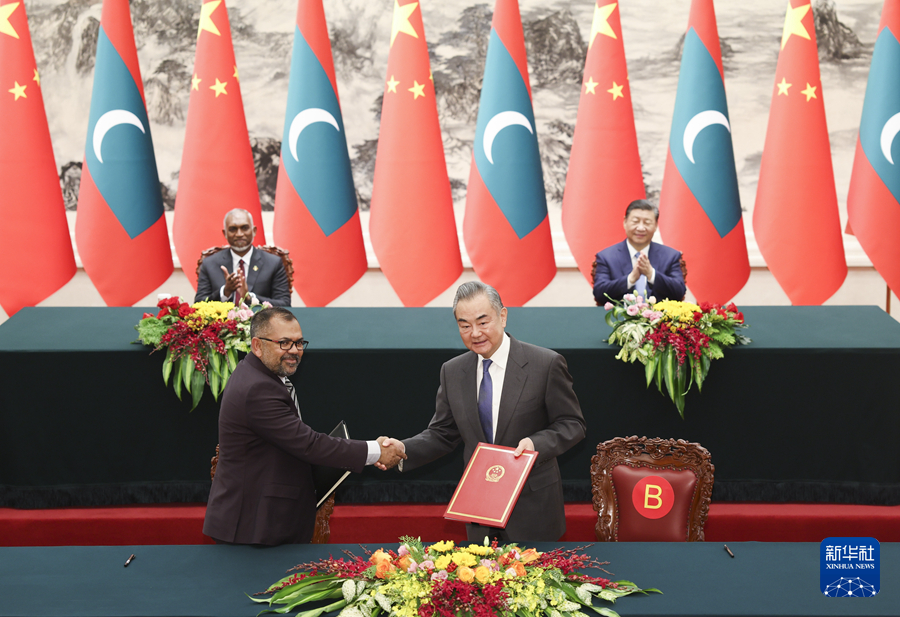 ??1月10日下午,國家主席習近平在北京人民大會堂同來華進行國事訪問的馬爾代夫總統(tǒng)穆伊茲舉行會談。這是會談后,兩國元首共同見證簽署雙邊合作文件。新華社記者 丁海濤 攝