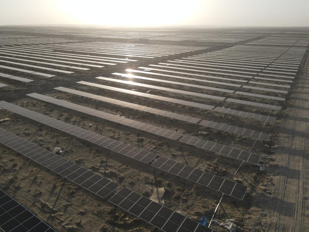 在烏茲別克斯坦卡什卡達(dá)里亞州和布哈拉州遼闊的大漠荒原上,太陽(yáng)能光伏板列隊(duì)排布,在陽(yáng)光映射下發(fā)出耀眼光芒。