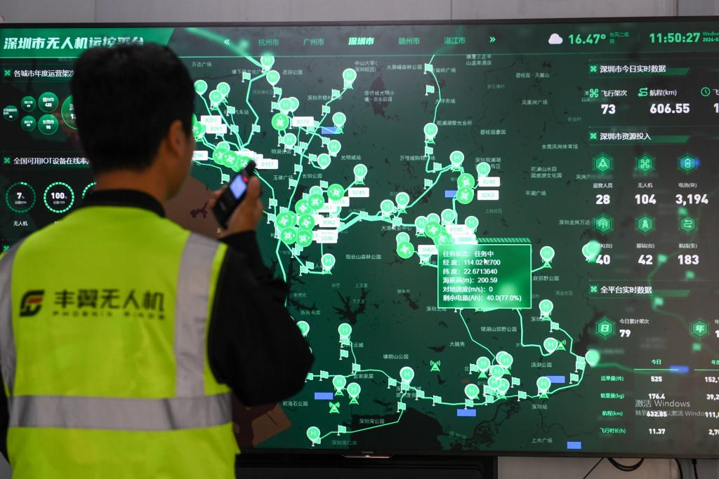 ??在豐翼科技(深圳)有限公司運(yùn)營中心,機(jī)長(zhǎng)對(duì)無人機(jī)進(jìn)行調(diào)度。