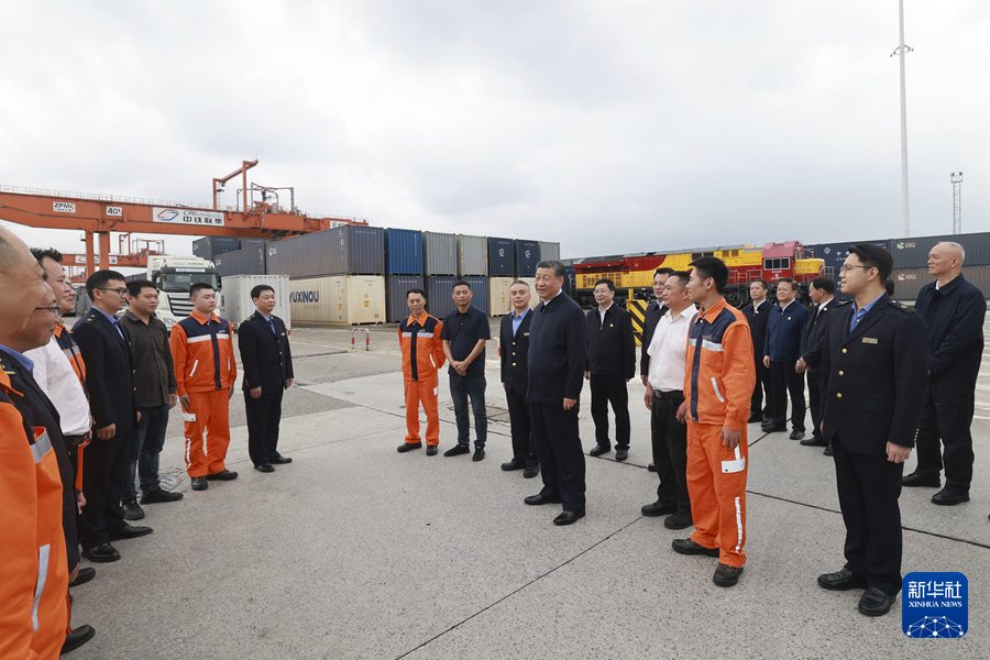 ??4月22日至24日,中共中央總書記、國家主席、中央軍委主席習(xí)近平在重慶考察。這是22日下午,習(xí)近平在重慶國際物流樞紐園區(qū)重慶鐵路集裝箱中心站,同貨車司機(jī)、列車司機(jī)、裝卸工人、場站管理人員等親切交流。新華社記者 王曄 攝