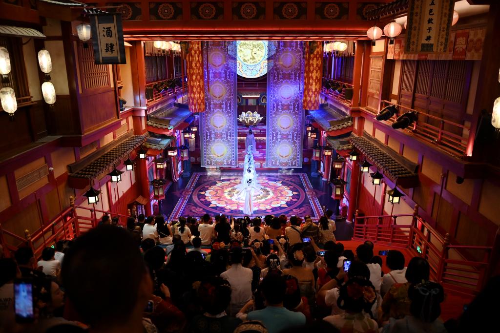2024年5月12日,游客在西安長安十二時辰主題街區(qū)內(nèi)觀看演出。新華社記者 李一博 攝