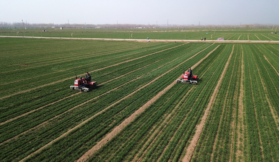 ??山東省汶上縣,農(nóng)民駕駛農(nóng)機在高標準農(nóng)田里進行小麥春季管護作業(yè)(2024年3月13日攝,無人機照片)。新華社記者 徐速繪 攝