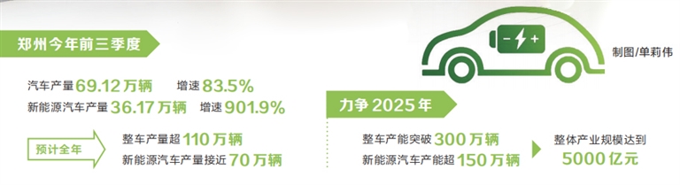“今年前三季度,鄭州汽車產(chǎn)量69.12萬(wàn)輛、增速83.5%,新能源汽車產(chǎn)量36.17萬(wàn)輛、增速901.9%。預(yù)計(jì)全年整車產(chǎn)量超110萬(wàn)輛,新能源汽車產(chǎn)量接近70萬(wàn)輛?!编嵵菔姓嚓P(guān)負(fù)責(zé)人表示,鄭州正在加快建設(shè)全國(guó)重要的新能源及智能網(wǎng)聯(lián)汽車研發(fā)和生產(chǎn)基地,力爭(zhēng)2025年整車產(chǎn)能突破300萬(wàn)輛、新能源汽車產(chǎn)能超150萬(wàn)輛,整體產(chǎn)業(yè)規(guī)模達(dá)到5000億元。