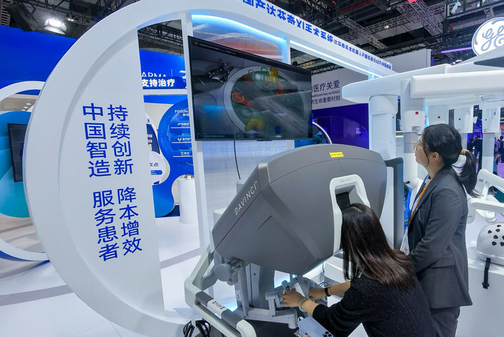 ??11月8日,一名參觀者(左)在第七屆進(jìn)博會醫(yī)療器械及醫(yī)藥保健展區(qū)復(fù)星醫(yī)藥展臺體驗(yàn)操作一款外科手術(shù)機(jī)器人。新華社記者 張鋮 攝