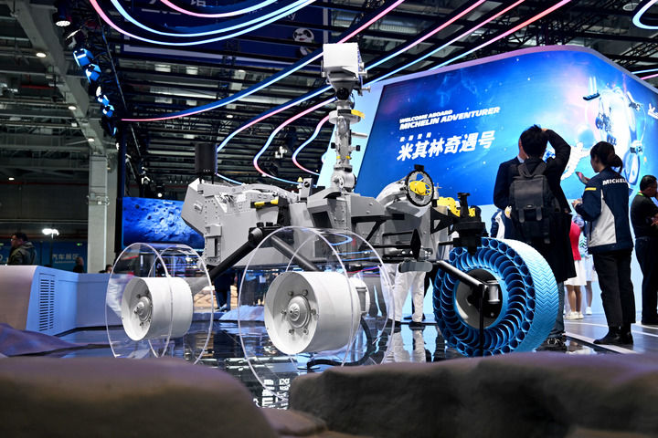 ??這是11月6日在第七屆進(jìn)博會汽車展區(qū)拍攝的在亞洲首次亮相的米其林月球探測車輪胎。新華社發(fā)(陳浩明 攝)
