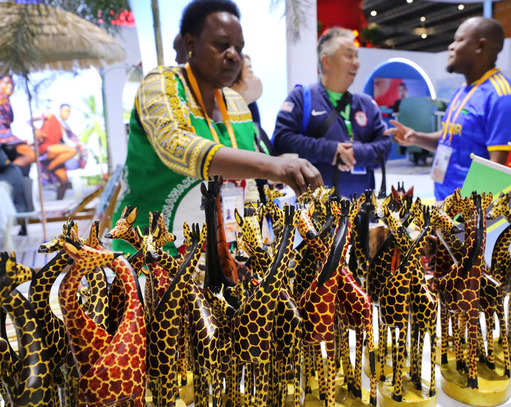 ??這是11月7日在第七屆進(jìn)博會國家展坦桑尼亞館拍攝的木雕藝術(shù)品。新華社記者 方喆 攝